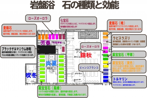各岩盤浴室に沢山の種類の岩盤浴石を使用しております。それぞれの特徴ある岩盤浴石でお楽しみください。